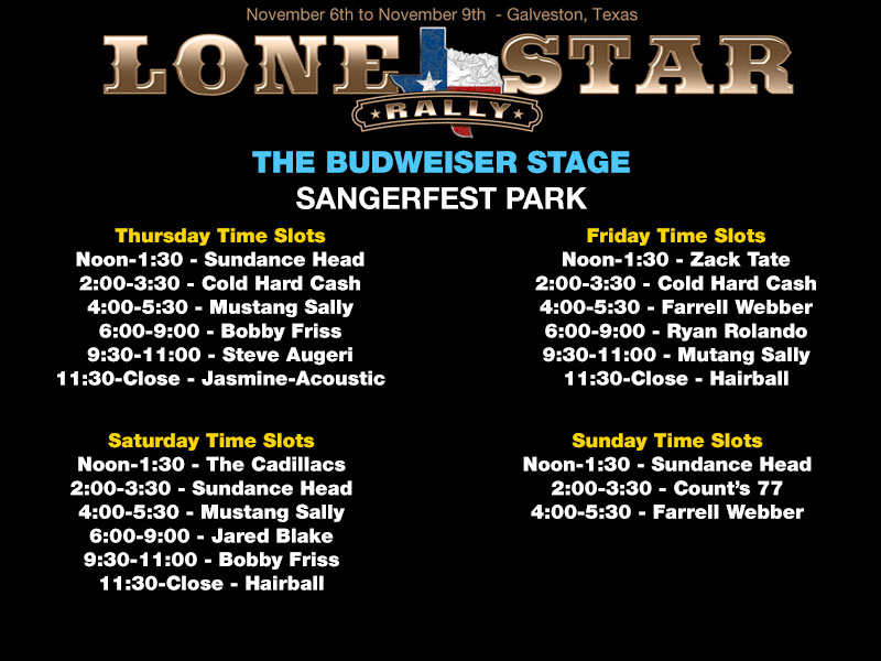 | DESCRIPTION | Farrell Webber will be live in concert on The Budweiser Stage at Saengerfest Park in Galveston, Texas on November 8th, 2015 for the Lone Star Rally! For all your Motorcycle Event information check out the Motorcycle Monster. For more information about this event, Please see below. |